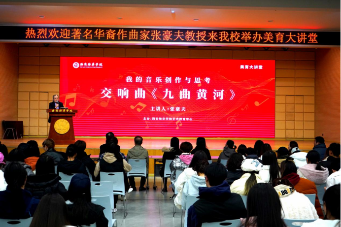为营造校园艺术氛围,深化大学生对音乐艺术创作文化内涵的领悟,12月2日,“我的音乐创作与思考——交响曲《九曲黄河》”讲座在恒友楼报告厅成功举办。旅欧资深作曲家、布鲁塞尔皇家音乐学院教授张豪夫受邀来校主讲,艺术教育中心主任刘荣弟教授主持讲座,艺术教育中心全体教师和大学生艺术团全体成员参加。