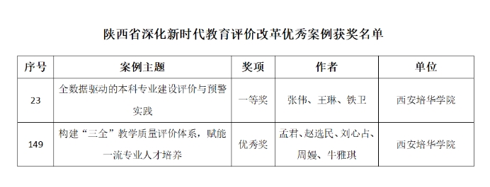 近日,中共陕西省委教育工委、陕西省教育厅下发《关于全省深化新时代教育评价改革优秀获奖案例的通报》(陕教工函〔2024〕346号)文件,多多28报送的《全数据驱动的本科专业建设评价与预警实践》案例获评一等奖,《构建“三全”教学质量评价体系,赋能一流专业人才培养》案例获评优秀奖,展现了学校在教育评价改革领域积极探索取得的成效。