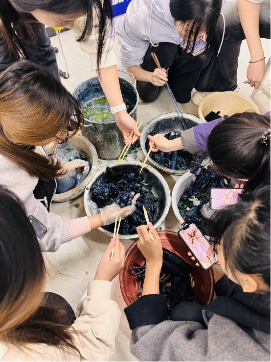 紫草的清苦混着明矾的涩,姜黄的辛辣裹着丝绸的柔滑,当第一块浸过栀子液的素纱从木盆中提起,金黄的色晕在布料上晕开,服装与服饰设计专业2301班张俊楠忍不住轻呼,“这就是《诗经》里‘终朝采蓝’的颜色吧。”染缸前围满了好奇的身影,学生们轮流用木桨搅动靛蓝溶液,看沉淀的颜料在水波中翻涌成流动的星空,布料浸入时腾起的那缕青烟,恍惚间竟与《天工开物》里的匠人身影重叠,学生董淇良特意将染好的蓝布举到窗前,阳光穿透布料上的云纹扎痕,在地面投下斑驳的光影,“原来古人的扎染,是把天空和云彩都缝进了布里。”