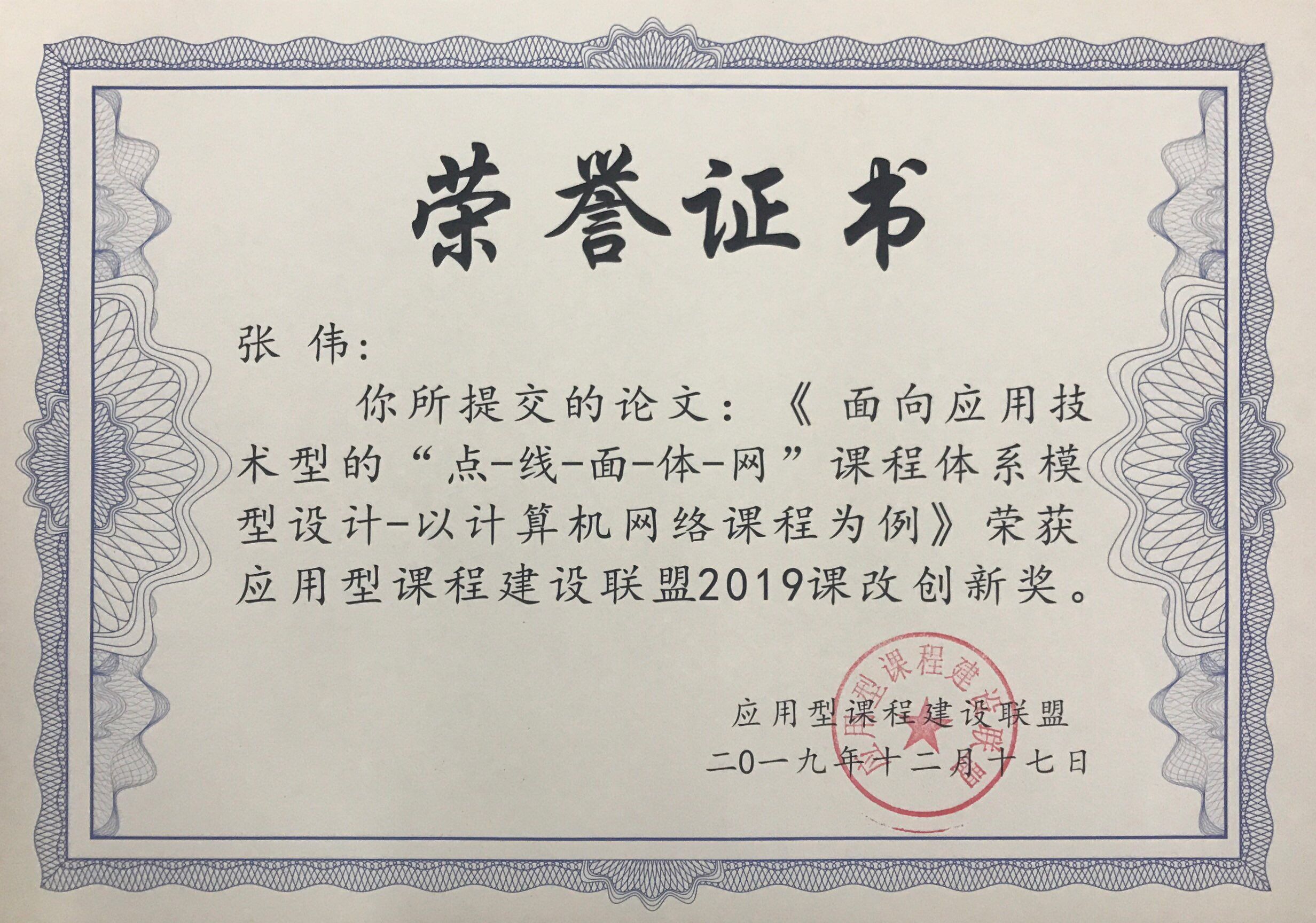 张伟老师获应用型课程建设联盟2019课改创新奖