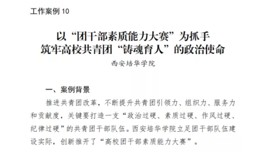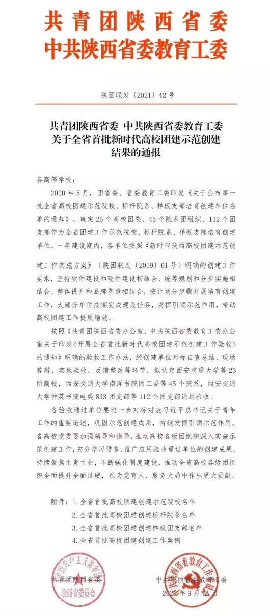 近日,由共青团陕西省委 中共陕西省教育工委发布的《关于全省首批新时代高校团建示范创建结果的通报》中,培华荣获“全省首批高校团建工作示范院校”称号,学校会计与金融学院团委荣获“全省首批高校团建工作标杆院系”称号,5个团支部荣获“全省首批高校团建工作样板团支部”称号,“以团干部素质能力大赛为抓手筑牢高校共青团‘铸魂育人’的政治使命”工作案例入选全省首批高校团建创建工作案例。