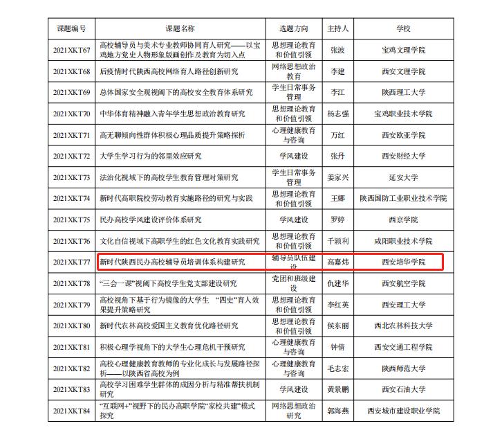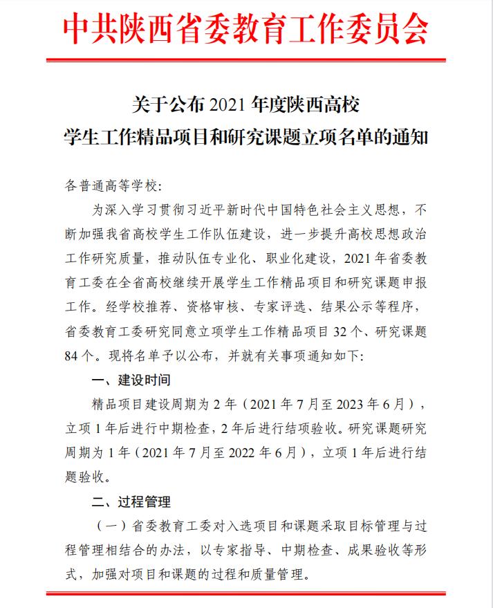 近日,中共陕西省委教育工委发布了关于公布2021年度陕西高校学生工作精品项目和研究课题立项名单的通知。经学校推荐、资格审核、专家评选、结果公示等程序,省委教育工委研究同意立项学生工作精品项目32个、研究课题84个。