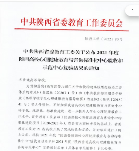 近日,中共陕西省委教育工作委员会发布了《关于陕西高校心理健康教育与咨询标准化中心验收和示范中心复验结果的通知》,其中,我校学生潜能发展中心顺利通过“陕西普通高校心理健康教育与咨询示范中心”复验,且为本次通过复验学校中的最高分。