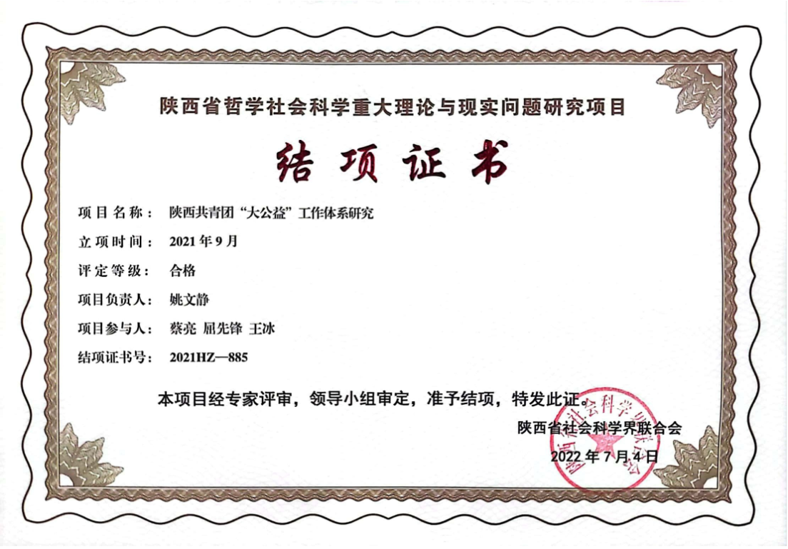 近日,陕西省社会科学界联合会、共青团陕西省委发布关于2021年全省共青团和青年工作调查研究优秀课题结项通知。按照《陕西省哲学社会科学重大理论与西安市问题研究项目管理办法》及《陕西省哲学社会科学合作研究项目管理办法》规定对29项立项项目进行评审,其中由我校党委副书记、副校长姚文静副教授主持的课题《陕西共青团“大公益”工作体系研究》成功结项,同时该项课题获得省社科联资助经费5000元。