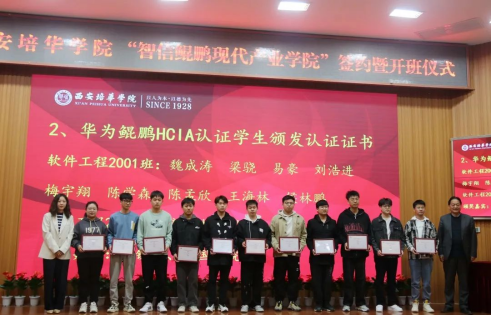 开班仪式上,西安西软云智信息科技有限公司总经理贾锐、培华智能科学与信息工程学院院长程国建还为取得华为鲲鹏HCIA认证的学生颁发了认证证书。