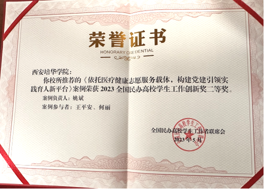 《依托医疗健康志愿服务载体,构建党建引领实践育人新平台》案例荣获2023全国民办高校学生工作创新奖二等奖