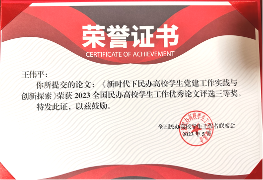 《新时代下民办高校学生党建工作实践与创新探索》论文荣获2023全国民办高校学生工作优秀论文评选三等奖