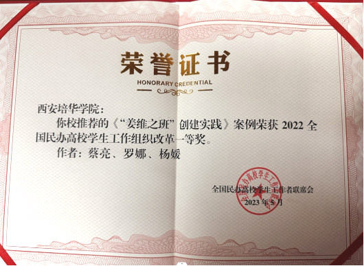 《“姜维之班”创建实践》案例荣获2022全国民办高校学生工作组织改革一等奖