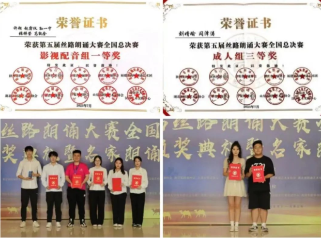播音与主持艺术专业学生许朔、赵霈仪、孙一宁、张梓莹、高凯含荣获影视配音组一等奖,播音与主持艺术专业学生刘婧瑜、闫泽涛荣获国赛成人朗诵组三等奖。