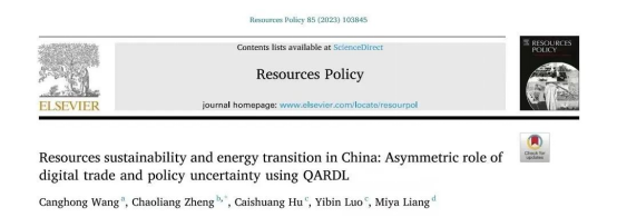 近日,我校会计与金融学院王仓红博士作为第一作者,学校作为第一署名单位的研究成果《中国资源可持续性和能源变迁:利用分位数自回归滞后模型分析数字贸易和政策的非对称性作用》,在SSCI收录期刊《Resources Policy》发表,该期刊创办于1974年,致力于研究资源的开采、生产和利用中的经济与政策问题,是一本被Web of Science收录的国际知名期刊,位列JCR分区Q1,中科院分区一区Top刊,2023年影响因子10.20。