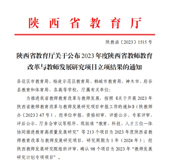近日,陕西省教育厅公布了2023年度陕西省教师教育改革与教师发展研究项目立项名单,其中,学校建筑与艺术设计学院刘杰申报的“基于工程认证的土建类专业教学质量评价指标体系研究”和教师教学发展中心张伟申报的“应用型本科高校教师职业胜任力素质模型与评价体系研究”获批立项。