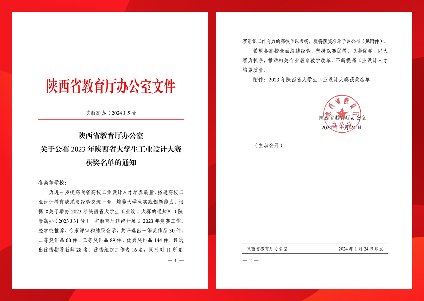近日,由陕西省教育厅主办的2023年陕西省大学生工业设计大赛获奖名单公布。学校共获得一等奖3项、二等奖1项、三等奖2项、优秀奖2项、优秀辅导教师5名。学校作为本次大赛唯一斩获一等奖的民办高校,总成绩创历史新高。