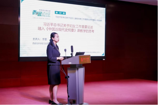 在教学展示环节,李雯副教授作题为《习近平总书记关于妇女工作重要论述融入<中国近现代史纲要>课程教学的思考》的分享。她讲到,妇女奋斗的光辉历史在中国共产党百年党史中意义重大,教师要讲好中国故事、讲好妇女奋斗故事,要展示新时代伟大变革中的巾帼力量。