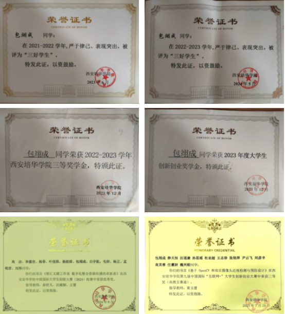 “竞赛是检验知识的试金石”,如果说课堂是包翊成的主战场,实验室就是他施展才华的又一片蓝天,大一时,他主动加入“人工智能标注”横向课题,初次接触科研的魅力,便展现出敏锐的洞察力,还跟随老师深度参与两项产学研融合横向课题,分别是《电子商务平台开发》和《基于VSphere技术的农业大数据云平台设计与实现》。