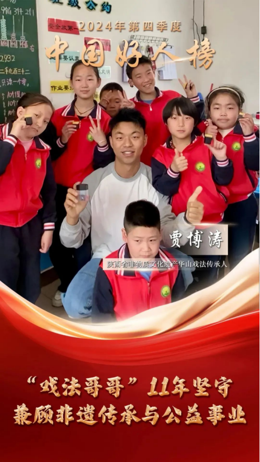 作为华山戏法第五代传承人,贾博涛肩负传承使命,赴渭南市临渭区、华阴市、潼关县等县(市、区)的70余个乡镇、160余个村(社区),开展公益非遗宣传、公益惠民演出,累计演出400多场,惠及观众万余名。同时,他还将戏法与现代传播方式结合,通过短视频、直播和舞台表演,让更多年轻人了解并爱上这门古老技艺。贾博涛同时还是当地困难儿童公益大使。他将非遗传承与公益事业相结合,义务演出、免费培训,让中国传统古彩戏法成为特殊儿童快乐自信成长的基本技能。