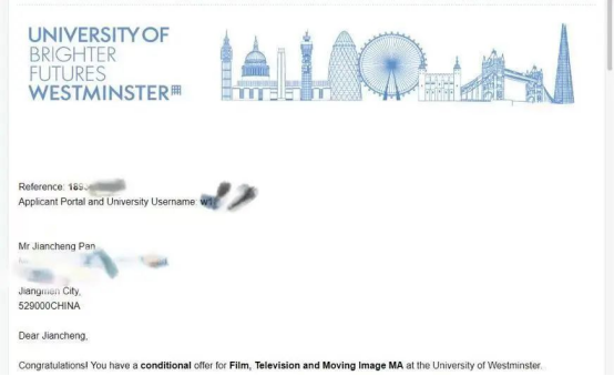 在多个offer之中,潘建丞选择了媒体排名全英第一的威斯敏斯特大学,他深入探索了电影创作的核心环节,从剧本创作到电影发行,每一步都走得坚实而有力。Virginia Pitts教授的剧本创作课程,让他学会了如何构思故事的情感核心,探索跨文化叙事的可能性;而George教授的电影发行课程,则让他对电影市场的动态与多样性有了更加深刻的认识。