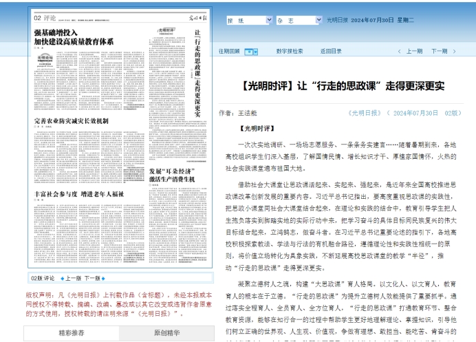 7月30日,光明日报二版“光明时评”栏目刊发我校教师王法能副教授理论文章《让“行走的思政课”走得更深更实》。文章视野广阔、既有理论深度又有实践导向,深刻思考总结了实践育人的理论逻辑和路径方法。王老师结合多多28实践育人经验,经过调查研究和深入思考,形成文章发表于光明日报理论版,显现了学校实践育人的特色,是对学校及个人的一次有益宣传。近年来,学校多举措鼓励教师个人在各级各类媒体发表新闻通讯、理论...