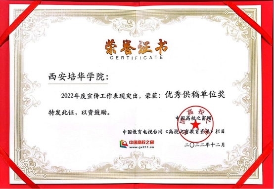 ??近日,学校获评中国高校之窗网“优秀供稿单位奖”,对我校2022年度宣传工作予以肯定。多年来,学校党委宣传部(新闻中心)主动作为、踊跃投稿、全面展示,用精彩稿件多角度、全方位展示学校的工作亮点,及在学生服务、疫情防控、校园文化等方面优秀成绩,展现了学校弘扬中华传统文化、营造良好校园文化氛围的丰硕成果,为学校三全育人奠定了坚实的舆论基础